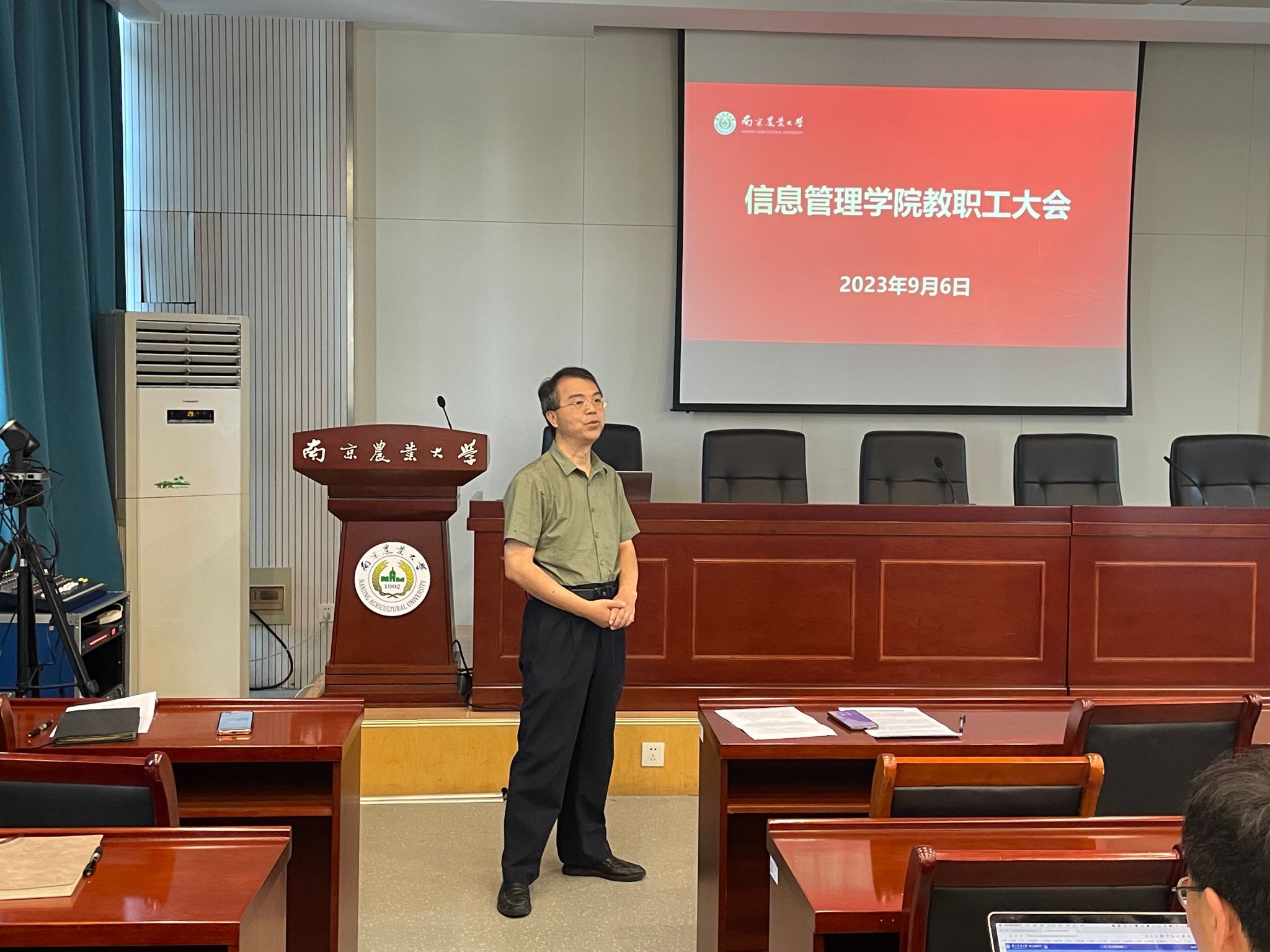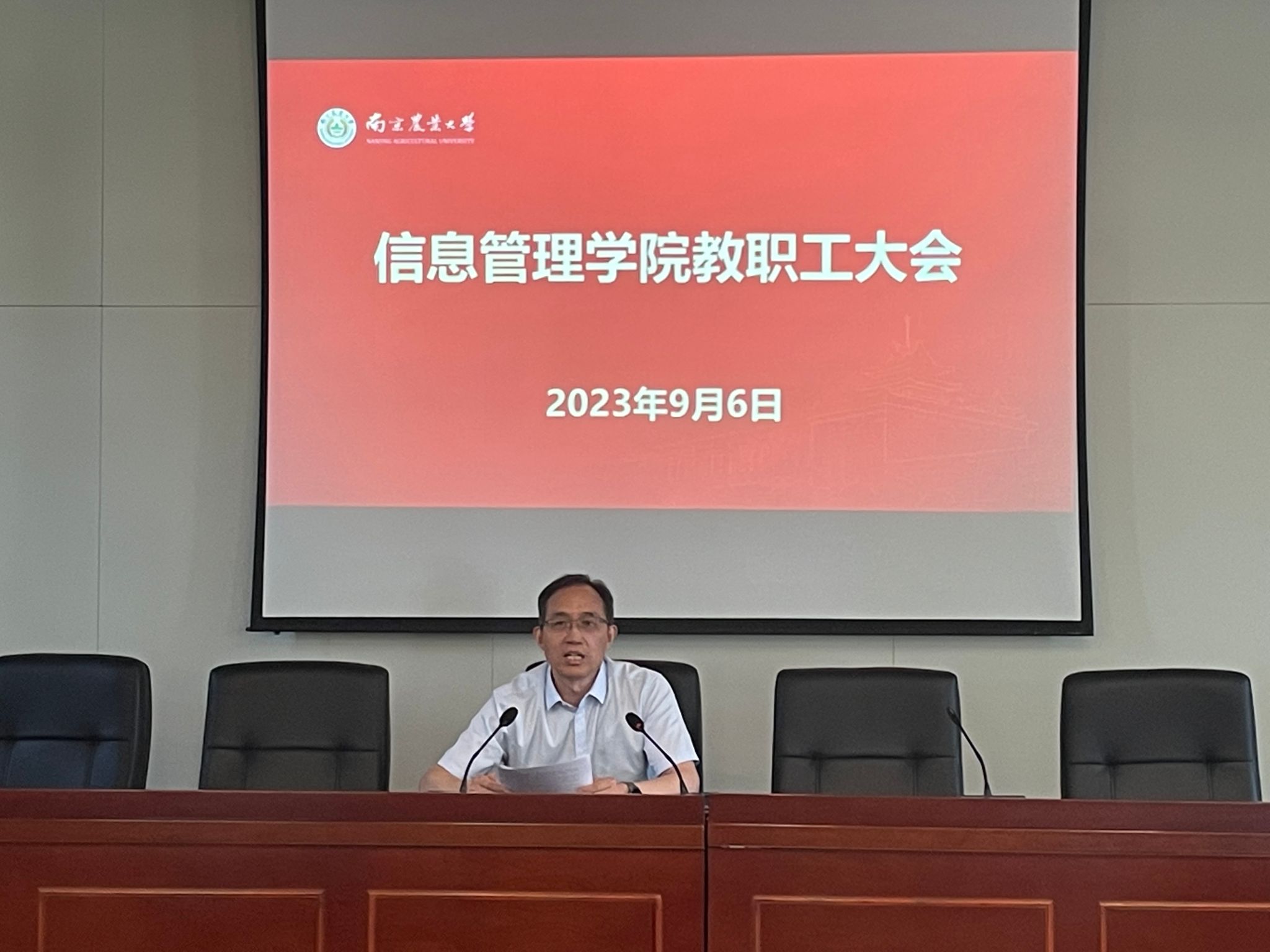 在浦口校区育贤楼C502召开新学期工作会议,全体教职工参会,会议由党委书记郑德俊主持。