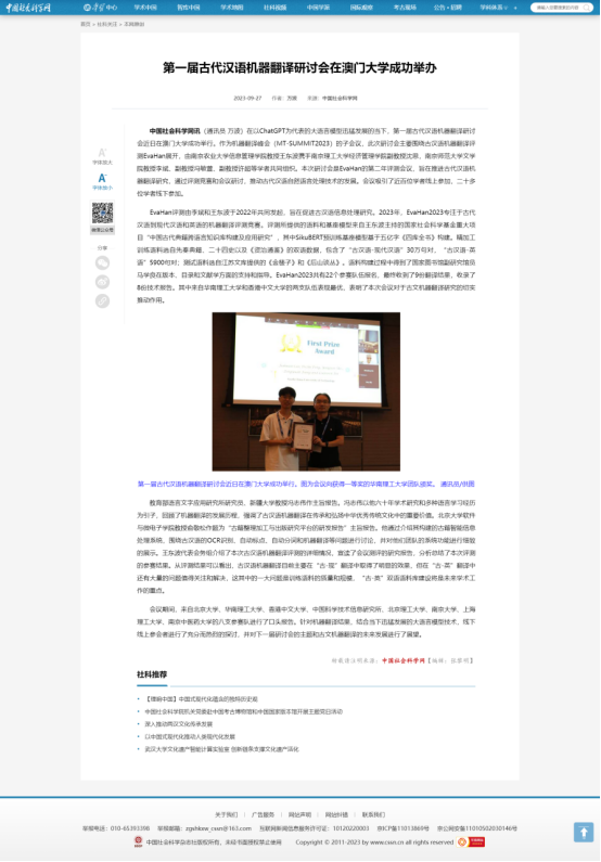 9月27日,【中国社会科学网】报道91自拍 王东波教授团队主导组织的全球第一届古代语言机器翻译研讨会成功举办。