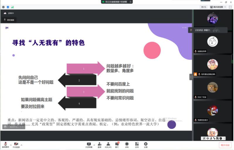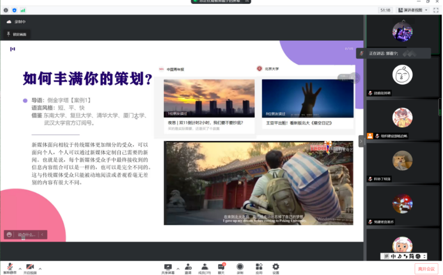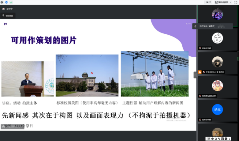 随后,郭嘉宁传递了运营新媒体平台需要有技巧、有地位的理念,介绍了新媒体可融文字、音频、画面于一体,做到形式的表现丰富和多样化,并推荐学生干部向东南大学、复旦大学等高校平台学习,打造“人无我有”的南农特色。