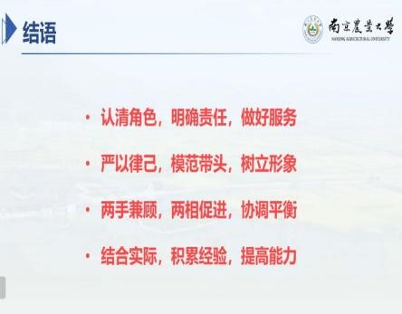 黄志恒指出,作为学生干部,应当树立正确的领导观念,秉持公仆、民主、开拓与参与意识。接着,黄志恒阐述了学生干部的使命与任务,并希冀每位学生干部能够做到谋事有高度、处事有原则、做事有方法、凡事有反馈。最后,黄志恒寄语每位学干避免误区,砥砺前行。