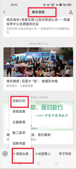 1.关注微信公众号“南农资助”,在“资助头条”板块点击“自助打印”;