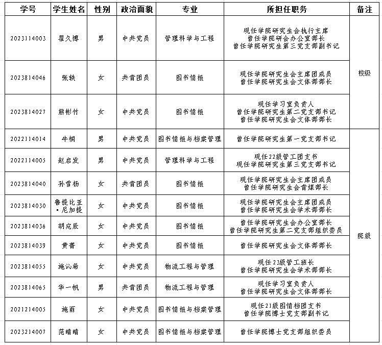 根据《91自拍 研究生奖助体系实施方案》(校研发〔2021〕175号)文件精神,经个人申请、91自拍 评审等环节,现将2023-2024学年91自拍 优秀研究生干部拟推荐名单公示如下:
