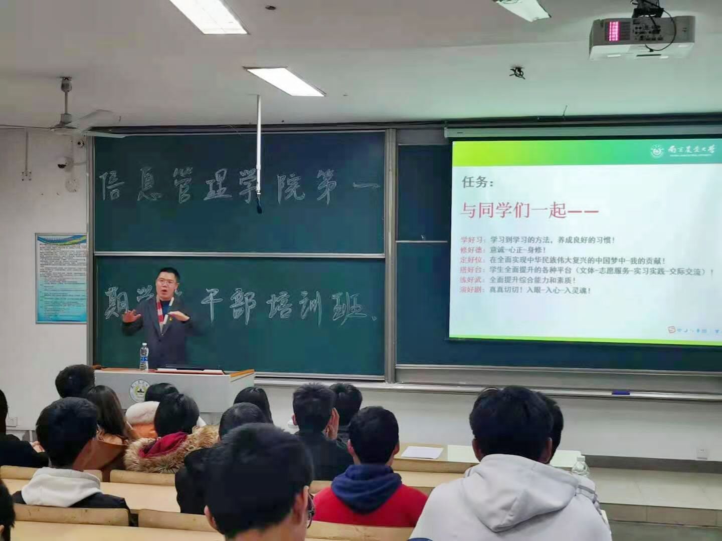 王春伟老师从“释学生干部”、“悟学生干部”、“做学生干部”三个方面出发,深入浅出地说明了学生干部的角色定位、学生干部的使命与任务、学生干部的能力和素质。分享自己作为学生干部的故事,幽默却又不失激情地向同学们阐释了如何成为一名合格的学生干部,最终培训在阵阵掌声中结束。