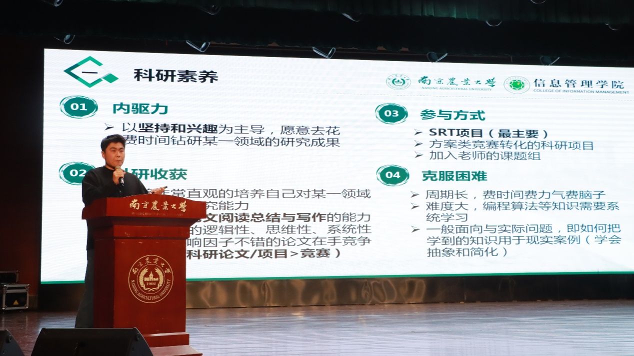 大会进行第三项表彰:科研卓越奖。周建鹏老师为郑璨、侯兆晗等获奖代表颁发“科研卓越奖”。获奖者是国家级SRT已结题项目团队,国家专利获得者,国家级比赛二等奖及以上获得者与科研论文作者。随后,周老师为同学们进行生涯规划经验指导,梁韬同学作为获奖代表分享他的科研经验。