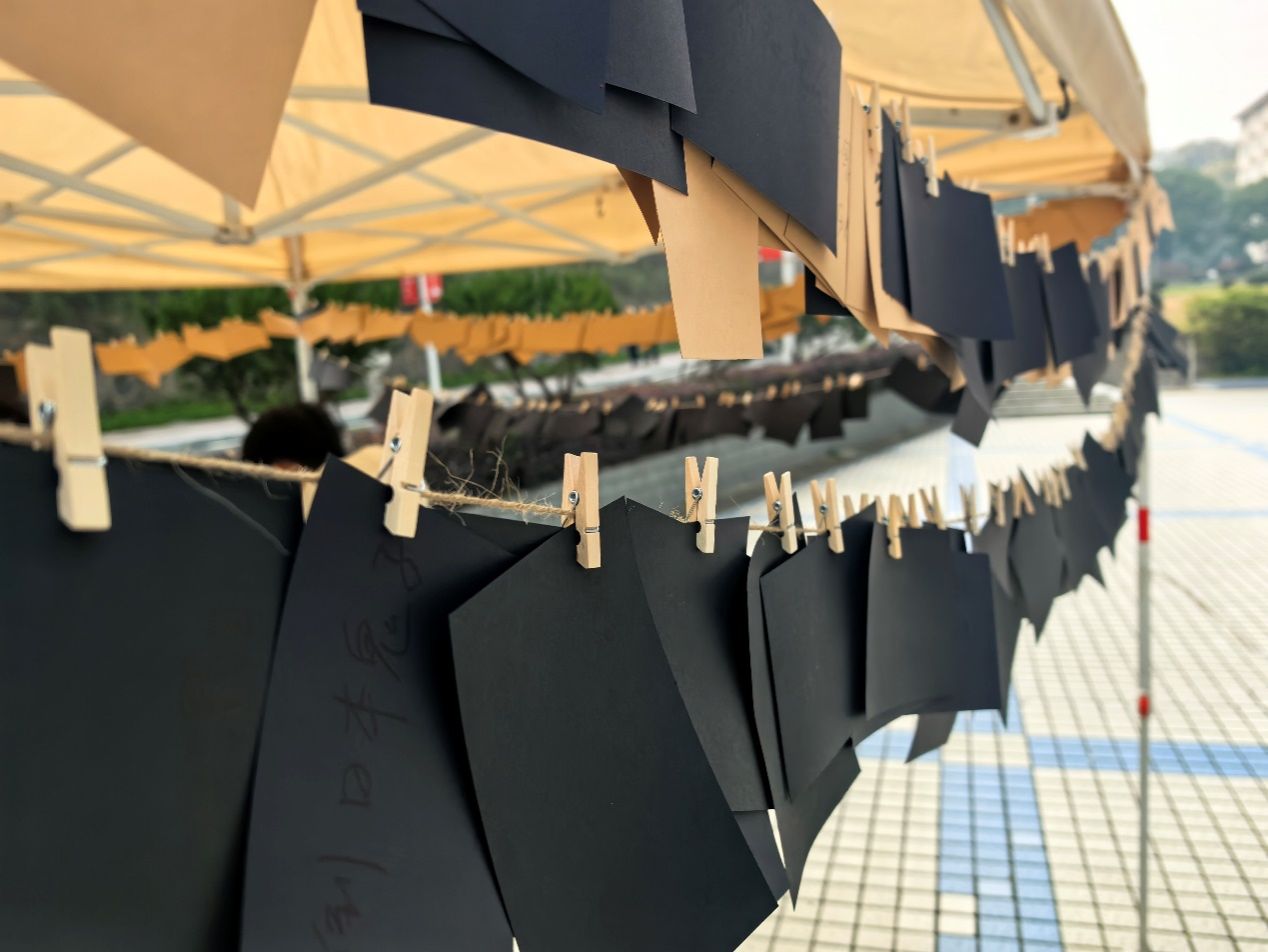 黑色的明信片映照出今日的情感,同学们用金色、银色的笔在沉重的背景下书写和平祈愿与祝福。这些明信片不仅表达对遇难同胞的深切悼念,更蕴含对和平的殷切期望。同学们将明信片悬挂在帐篷周围,供过往同学共同查看,传递和平理念。