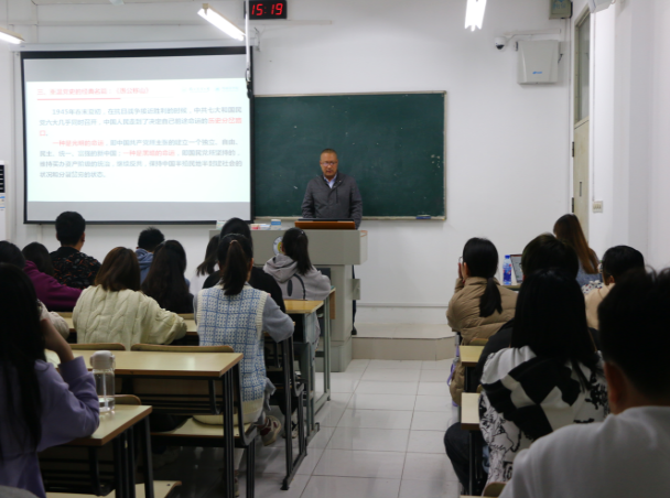 讲课开始前辅导员夏丽君为同学们简要介绍韩立新,并且强调党课学习对于入党积极分子的重要性。韩立新以“什么是党史,为何要学习党史,学习党史的意义在哪里”三个问题开篇,通过讲述学习党史的重大意义、树立正确党史观、重温党史的经典名篇、传承弘扬伟大的精神四个方面加深入党积极分子对党史学习重要性的认知。将党史学习与学生的日常生活结合,使同学们切实感受到党史的学习不仅仅停留在书本,更是要把党史学习成功应用于实践。韩立新还联系自己多年的工作经历,进一步举例说明学习党史不是只停留在面子工程,而是需要用三个必然要求、六个进一步来不断温新巩固,希望同学们可以将学习党史做为一道怎样答好的必答题而不是如何答好的选择题。讲课结束后由党建班班长李歆做出总结,希望同学们从党史中汲取前行之力,在学习党史的路上明志、致知、励行。